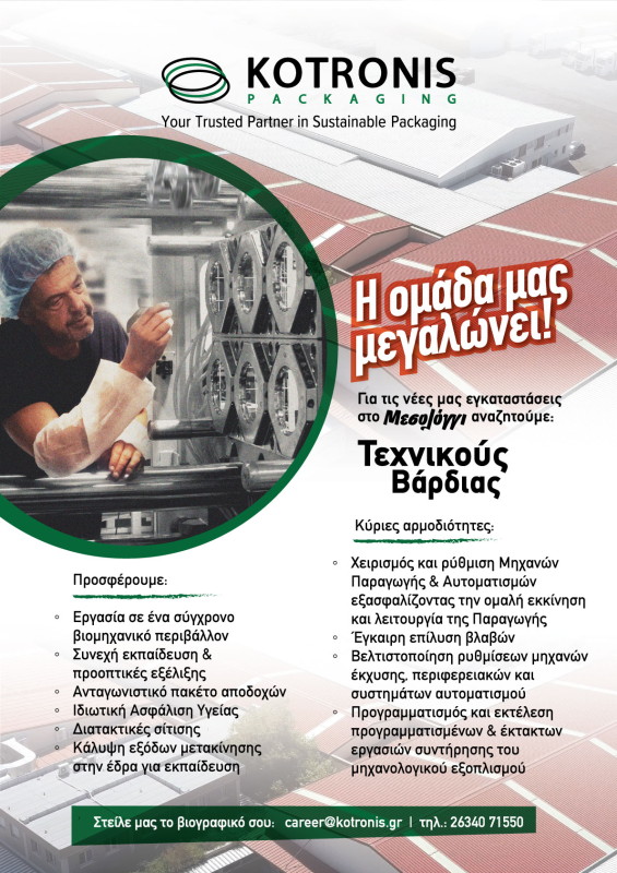 Kotronis Packaging, based in Nafpaktos, has specialized in the manufacture of 100% recyclable plastic containers and lids suitable for food packaging for the past 50 years. With a fully-equipped in-house machine shop and an experienced design and engineering team, we are pioneers in developments and offer innovative, sustainable, and stylish packaging solutions. Every year, more than 500 million packaging products are manufactured in our state-of-the-art facilities and distributed in 15 countries worldwide.